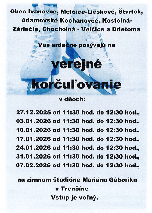 Verejné korčuľovanie zdarma na zimnom štadióne Mariána Gáboríka v Trenčíne môžete využívať aj naďalej - od 27.12.2025 do 7.2.2026 každú sobotu v čase od 11:30 do 12:30.